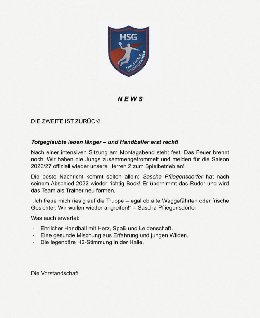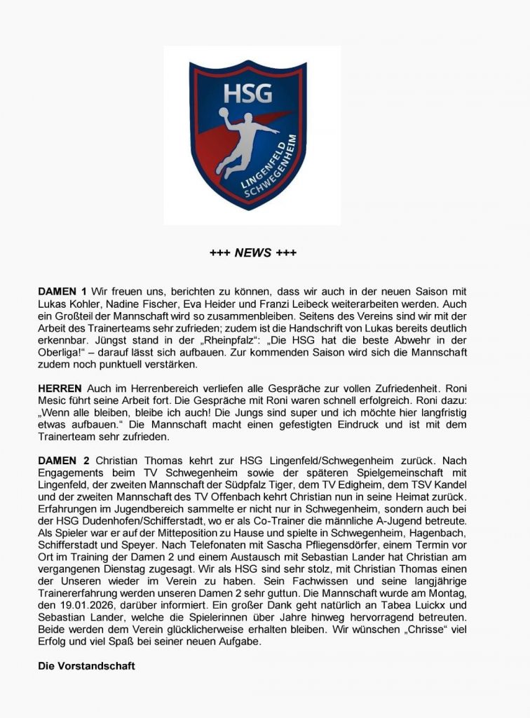 Christian, der derzeit als Co-Trainer bei den Damen tätig ist, wird nun die Position des Cheftrainers übernehmen. Mit ihm haben wir einen herausragenden Fachmann an der Seitenlinie. Sein fundiertes Handballwissen und seine langjährige Erfahrung machen ihn zu einer perfekten Besetzung für diese Rolle. Er hat bereits als Trainer in Lingenfeld und Schwegenheim erfolgreich gearbeitet. Die Erweiterung des Trainerstabs neben Eva, unserer Torwarttrainerin, wird in den nächsten Wochen bekanntgegeben. Jetzt ist es an der Zeit, die verbleibenden Spiele zu genießen und Jan einen angemessenen Abschied zu bereiten.